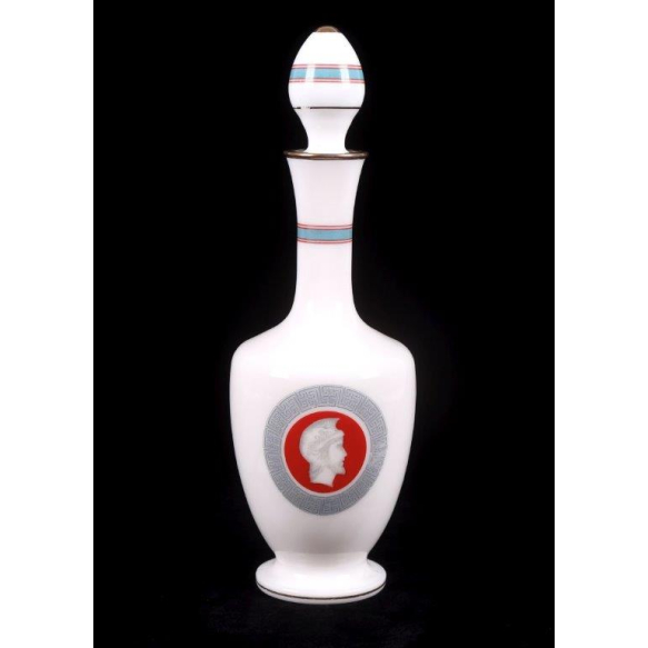 MARNIER - LAPOSTOLLE - Garrafa em Opalina branca, decorada com figuras gregas da mitologia ao centro e filete de ouro no boca. 32 cm alt. 10 cm diâm. França Sec XIX