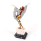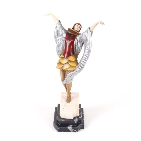 ROLAND PARIS (1894–1945) - Dançarina Art Déco - "Heavenly" Escultura em bronze patinado e policromado, representando uma elegante dançarina em movimento, de braços erguidos e expressão altiva. A figura, típica da estética Art Déco da década de 1920, veste traje estilizado em vermelho e amarelo com manto prateado esvoaçante, transmitindo leveza e dinamismo. 26 cm alt. sem a base e 35 cm completa.