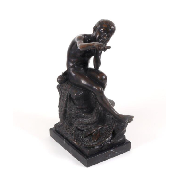 GEORG WOLF(1858–1930) - Escultura de bronze fundido, "O MENINO PESCADOR", BERLIN- Georg Wolf (1858–1930) foi um escultor alemão de origem judaica, nascido em San Francisco (EUA) e radicado na Alemanha desde a infância. Estudou inicialmente arquitetura em Viena e Munique, mas se dedicou à escultura ao ingressar na Academia de Belas Artes de Berlim, onde foi aluno do renomado escultor Fritz Schaper. A partir de 1890, estabeleceu seu próprio ateliê em Charlottenburg, Berlim, e passou a participar regularmente da Grande Exposição de Arte da cidade. Sua produção escultórica, de estilo realista e academicista, é marcada por peças em bronze de pequeno e médio porte, muitas das quais foram fundidas pela prestigiosa fundição Gladenbeck. Entre suas obras mais conhecidas estão Angelnder Knabe (Menino pescador), uma escultura em bronze com base de mármore, e Der Flößer (O rabequeiro-flutuador), instalada na cidade de Toruń (atualmente na Polônia) em 1914. Wolf era irmão da artista Julie Wolfthorn, uma importante figura da arte moderna em Berlim. Faleceu em 1930 na capital alemã e foi sepultado no Cemitério Sul-Oeste de Stahnsdorf. Seu trabalho é lembrado por sua elegância técnica, sensibilidade figurativa e contribuição para a escultura alemã do final do século XIX e início do século XX. 43 cm altura.