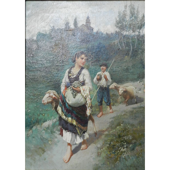 Micchetti, Francisco Paolo (1851 – 1929) - Camponesa - OST - CID - Francesco Paolo Michetti (1851 – 1929) Francesco Paolo Michetti foi um pintor e fotógrafo italiano nascido em Tocco da Casauria, Abruzzo, em 1851, e falecido em Francavilla al Mare, em 1929. Considerado um dos maiores representantes do verismo italiano, destacou-se por retratar com intensidade a vida, a religiosidade e os costumes populares de sua região natal. Formou-se artisticamente em Nápoles, onde se aproximou de tendências realistas, e aperfeiçoou-se em Paris, entrando em contato com o impressionismo e a fotografia, que passou a utilizar como recurso auxiliar em sua criação. Essa experiência ampliou sua visão cromática e lhe conferiu uma abordagem inovadora para a época. Sua obra é marcada pelo uso vibrante da cor, pela luminosidade e pela representação de multidões e rituais coletivos, sempre com forte carga emotiva. Entre seus temas mais frequentes estão procissões religiosas, festas campestres e cenas do cotidiano dos camponeses. Entre suas obras mais célebres estão Il Voto (1881), considerada sua obra-prima, e Processione del Corpus Domini a Chieti. Michetti também foi um prolífico fotógrafo, registrando centenas de imagens que serviram tanto como estudos para suas pinturas quanto como documentação etnográfica da cultura dos Abruzzos. Em Francavilla al Mare, criou o Convento Michetti, um centro cultural que reuniu artistas e intelectuais italianos, entre eles o escritor Gabriele D’Annunzio, de quem era grande amigo. Essa convivência consolidou Michetti como figura central na vida artística e cultural da Itália no final do século XIX. Reconhecido nacional e internacionalmente, participou de diversas exposições e conquistou prestígio durante sua carreira. Seu legado permanece como um dos mais autênticos retratos da vida popular italiana, equilibrando tradição, observação realista e sensibilidade estética. 50 cm x 35 cm.