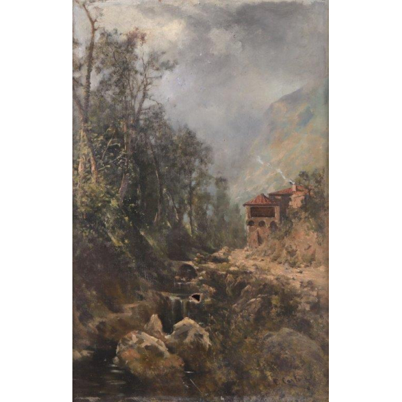 EDOARDO CORTESE Paisagem com casa - OST - CID - (Tela com rasgo) filho de Federico e Luísa Fonseca, formação em pintura foi muito precoce, na escola do pai, que também o fez matricular-se em cursos no Instituto de Belas Artes. Aos vinte e um anos, em 1877, apresentou sua primeira obra, At the Fountain (erroneamente atribuída a seu pai em Thieme-Becker), na Exposição Nacional de Nápoles. 63 x 40 cm