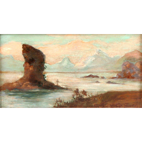 CARLO DE SERVI (1871–1947) – Óleo sobre madeira, Pedra de Itapuca. Pintor italiano nascido em Lucca, formado na Escola de Belas Artes local e aluno de Alfredo Norfini em Roma, atuou intensamente no Brasil entre o fim do século XIX e início do XX, com presença em São Paulo, Belém e Rio de Janeiro, reconhecido por retratos, composições alegóricas e obras de caráter acadêmico, integrando acervos como a Pinacoteca do Estado de São Paulo e o Museu Nacional de Belas Artes. Ass. CID. Dimensões: 11 × 20 cm.