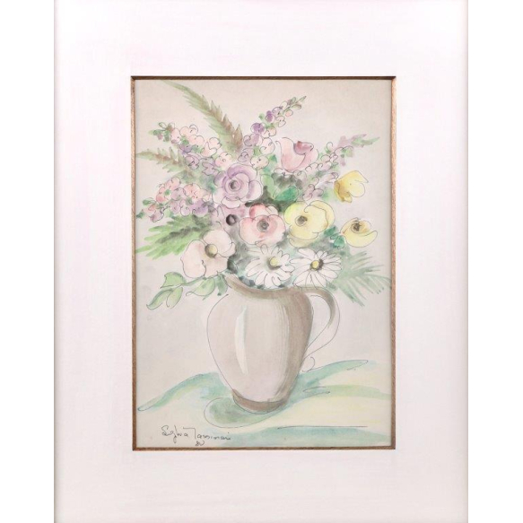 SOPHIA TASSINARI – Flores. Aquarela, datada de 1980. Artista paulista com formação junto a Theodoro Braga, Anita Malfatti, Mário de Andrade e o Grupo Guanabara, com especialização em restauração na Itália e França. Assinado no canto inferior esquerdo. Dimensões: 34 × 24 cm.