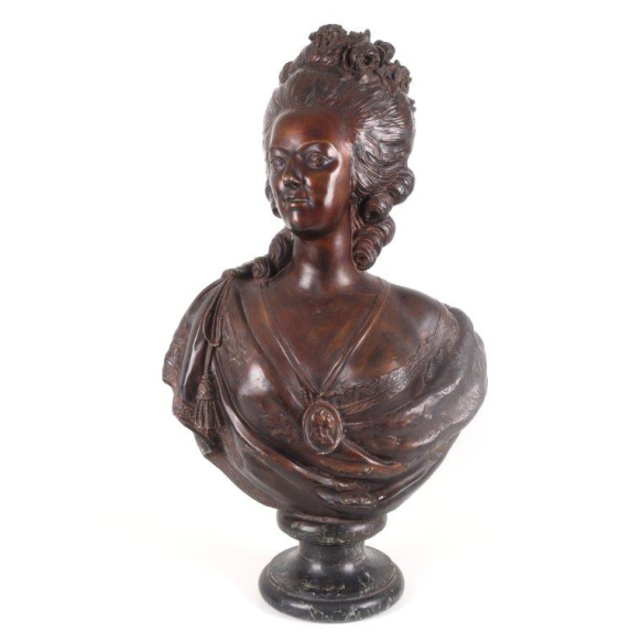 FÉLIX LECOMTE (1737–1817) – Busto representando Maria Antonieta. Estuque. Escultor francês da segunda metade do século XVIII, vencedor do Prix de Rome em 1758, com formação em Roma entre 1761 e 1768, membro da Académie Royale desde 1771, reconhecido por sua produção neoclássica e por obras como Œdipe et Phorbas. Dimensões: alt. 90 cm.