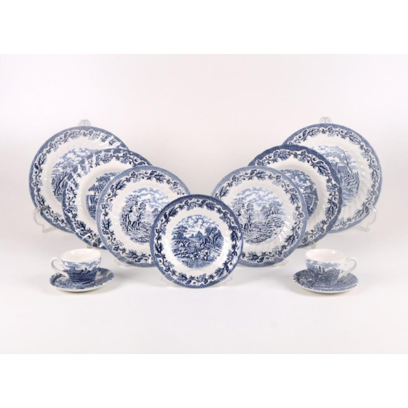 Remanescente jogo de jantar em porcelana esmaltada inglesa, Royal Wessex, composto por 70 peças: 24 pratos rasos, 12 pratos fundos, 12 pratos de sobremesa, 12 pratos para pães e 10 xícaras com pires. (Observação: um prato de sobremesa com bicado).