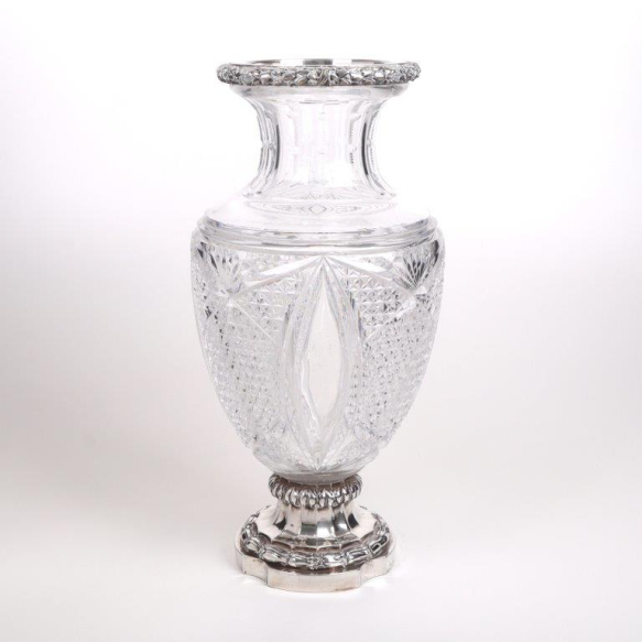 BACCARAT - Belíssimo vaso em cristal manufatura baccarat, com trabalho em bico de jaca, sobre base e virola em prata de lei, contraste cabeça de Minerva. França, séc. XIX. Dimensões: 43 cm alt; 19 cm diâm. (Com pequenos bicados).