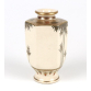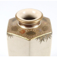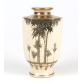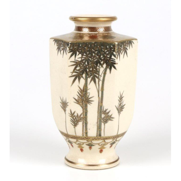 Elegante vaso em porcelana japonesa do tipo Satsuma, moldado em formato hexagonal com base circular e gola levemente aberta, realçada por filetes dourados. A decoração é composta por cenas de bambuzal (take) em douração sobre fundo marfim com craquelê fino, característico das peças Satsuma de alta qualidade. A parte superior do corpo apresenta friso ornamental em ouro, com detalhes geométricos e florais, enquanto as laterais destacam a composição minimalista dos caules e folhas de bambu, símbolo de resiliência e flexibilidade na iconografia japonesa, base ostenta cartela em esmalte vermelho com caracteres dourados Shichibeiemon, identificando o artista ou oficina de origem. Período provável de produção: Final do Período Meiji a início do Showa (c.1900-1930) - 17 cm.