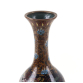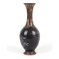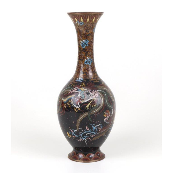 Imponente vaso japonês de cloisonné, corpo ovóide com longo pescoço afunilado e base circular. O fundo em esmalte preto translúcido realça a exuberante decoração de uma fênix em pleno voo, com penas em tons de azul, verde e vermelho, entre arabescos dourados e flores de lótus em azul-claro. O pescoço é ornamentado com ramos dourados e flores em esmalte azul, emoldurados por filetes metálicos. Base e borda superior com acabamento em metal escurecido. Peça de fino trabalho artesanal, datável do período Taisho a início de Showa (c. 1920-1940), representando a simbologia da fênix como emblema de imortalidade e prosperidade - Japão 30 cm.