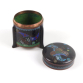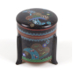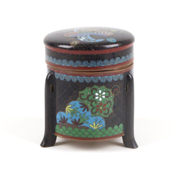 Pequena e refinada caixa japonesa de cloisonné, de formato cilíndrico, apoiada sobre três pés recurvados, com tampa levemente abaulada. A peça apresenta um fundo em esmalte preto decorado com intrincados arabescos dourados, contrastando com faixas em azul celeste e vermelho ferrugem que circundam o corpo e a tampa. A decoração inclui painéis geométricos preenchidos com pequenas flores estilizadas em esmaltes verdes, brancos, azuis e amarelos, além de motivos ondulados em espiral que decoram a faixa superior. A tampa segue o mesmo padrão decorativo, harmonizando o conjunto. Objeto típico da produção de cloisonné do final do período Meiji ao início de Taisho (c. 1900-1920), utilizado como caixa de incenso (kōgō) ou caixa para pequenos objetos preciosos - 9 x 8 cm.