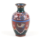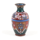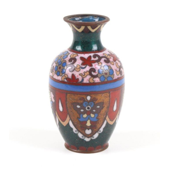 Delicado vaso japonês de cloisonné em miniatura, de corpo globular e boca levemente evertida, com decoração rica e policromada. Apresenta fundo em esmalte verde-escuro e faixas de fundo rosa com arabescos florais em tons de azul, vermelho e dourado, entremeados por medalhões ovais em esmalte marrom contendo motivos florais estilizados em azul e branco, o vaso é emoldurada por frisos em esmalte azul turquesa que realçam as divisões decorativas, enquanto o interior da boca exibe esmaltação azul brilhante. A técnica cloisonné evidencia-se pela precisão dos contornos metálicos que delimitam cada célula do esmalte, numa composição de cores vibrantes e marcante contraste Japão, Final do século XIX a início do século XX (Período Meiji, circa 1890-1910) -8,5 cm.