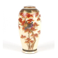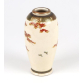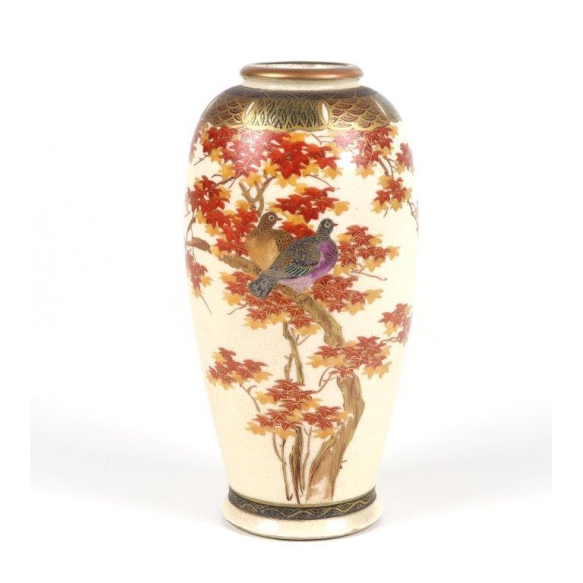 Vaso japonês de porcelana Satsuma, ricamente decorado com um motivo naturalista de pássaros pousados em galhos de bordo japonês (momiji) com folhagem outonal em tons de vermelho e laranja, sobre fundo esmaltado em marfim com fina textura craquelê. O colo do vaso apresenta friso decorativo em dourado com padrão geométrico e floral, típico do acabamento das peças de exportação do final do Período Meiji (1868-1912).A base do vaso traz um selo dourado com caracteres kanji Tegawa, provavelmente referindo-se ao artista ou ao ateliê responsável pela decoração da peça. O craquelê acentuado da esmaltação é uma característica distintiva das porcelanas Satsuma autênticas - 16 cm alt.