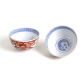 Par de tigelas em porcelana japonesa, decoradas em esmaltes policromados no estilo Kakiemon-Imari, com predomínio de vermelho -ferrugem, verde, azul e dourado.O corpo apresenta padrão exterior com reservas emolduradas com cenas florais e arabescos, sobre fundo vermelho-óxido decorado com crisântemos dourados. O interior das tigelas é adornado com um bordo em padrão geométrico azul (estilo “asa-no-ha”), e no fundo interno, uma cena em azul sob vidrado (sometsuke) representando um peixe carpa (koi), símbolo de perseverança e fortuna.A base apresenta inscrição auspiciosa em azul-cobalto: Tesouro Precioso do Reino da Longevidade - Japão -Século XX (provavelmente entre Era Taisho e Showa).duas tigelas imari 4,5 x 13,5