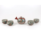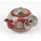 Conjunto de chá japonês composto por bule Kyusu com tampa e cinco tigelas (yunomi), em porcelana fina com fundo craquelado e decoração esmaltada em cores vibrantes. O bule apresenta corpo globular com bico lateral, decorado com reservas cartuchadas em vermelho ferrugem (akae) com motivos geométricos e florais, alternando com cenas de figuras orientais em paisagem. A tampa acompanha o mesmo padrão decorativo. As tigelas (yunomi) exibem decoração contínua de flores silvestres e folhas verdes, com delicados toques dourados. O interior é esmaltado em tom celadon claro, enquanto o exterior mantém o fundo craquelado característico das oficinas de Kutani. Peça típica da produção voltada para exportação durante o final do Período Meiji e início do Taisho, evidenciando o esmero técnico da escola Kutani na aplicação de esmaltes vítreos e desenhos detalhados- Período: Meiji/Taisho (c. 1900-1920) - Japão, Kutani Medidas do Bule (Kyusu): 10 x 14 x 14cm Diâmetro das Tigelas (Yunomi): 5 x 8 cm.