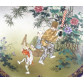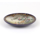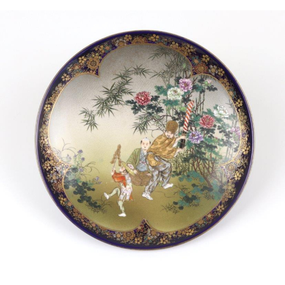 Prato decorativo de porcelana Satsuma, com fundo creme craquelado e borda azul cobalto com aplicações douradas. Cena central representando grupo de camponeses em paisagem floral. A base exibe carimbo do artista em vermelho, leitura provável como Kinzan. Período Meiji/Taishō - 20 cm 20 cm diâm.