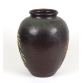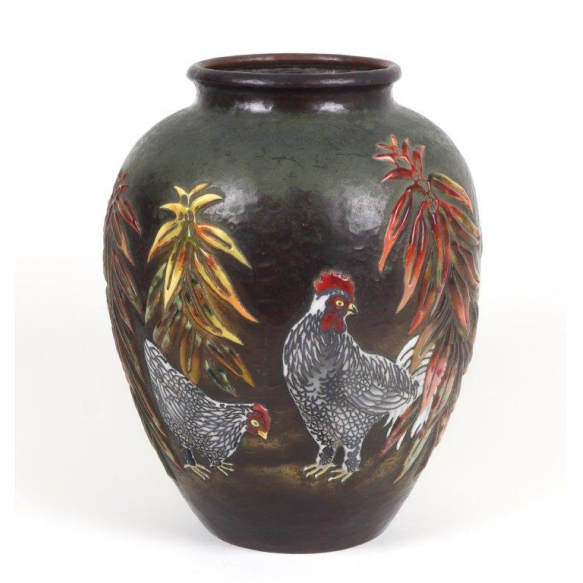 Importante vaso japonês em cobre fundido, de corpo ovóide e boca ligeiramente aberta, ricamente decorado em técnica "champlevé", com esmaltação aplicada em reservas cavadas na superfície. A cena principal apresenta galos e galinhas em meio a vegetação exuberante, com folhas e flores esmaltadas em tons vibrantes de vermelho, amarelo, verde e branco, sobre fundo marrom acobreado. O contraste de texturas, com áreas polidas e outras em baixo-relevo, evidencia a maestria do trabalho artesanal.Na base, marca da oficina Ando-zo, renomada manufatura de Nagoya ativa desde o período Meiji, especializada em trabalhos em cobre e cloisonné de alta qualidade, acompanhada do caractere ryuu, significando "Dragão", possível alusão ao nome do artista ou linha de produção. Período: Taisho a Showa inicial (c. 1920-1940). 32 cm alt, 22 cm diâm.
