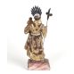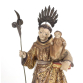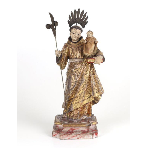 Bela imagem representando santo Antônio com menino jesus com rico trabalho em madeira entalhada, com vestes decorada em dourado e policromia, sobre base de madeira. 32 cm alt. (Necessita Restauro).