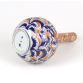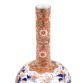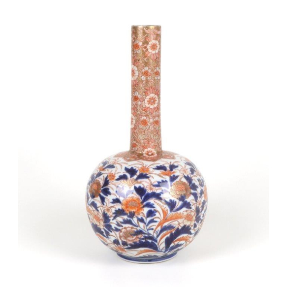 Vaso japonês em porcelana esmaltada, com a marca Juchiku Sei na base, indicando produção artesanal. A peça apresenta corpo globular que se estreita para um longo gargalo cilíndrico, característico de vasos de arranjos florais "Ikebana".O bojo é decorado com exuberantes flores de crisântemo e peónia, em tons de vermelho-ferrugem e dourado, contrastando com folhas azul-cobalto, técnica tradicional do estilo Imari. O gargalo exibe um requintado padrão floral dourado sobre fundo vermelho, remetendo à estética do estilo Satsuma, com minuciosos detalhes em dourado aplicados manualmente. Possivelmente início do século XX (Era Taisho ou início da Era Showa), inspirado nos estilos decorativos Edo-Meiji. Vaso Imari - 30 cm