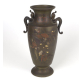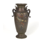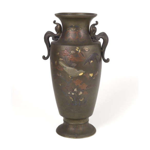 Elegante vaso japonês em bronze patinado, com delicada decoração em incrustações de cobre, prata e shakudo (liga de cobre com ouro), representando composição floral com folhas e flores variadas, além de pássaros minuciosamente delineados em voos e repouso. O corpo de formato cilíndrico alongado repousa sobre base circular, destacando-se pelas alças laterais estilizadas em forma de dragões ou quimeras, de fino trabalho em relevo. A boca larga e abaulada apresenta borda suavemente ressaltada. Peça exemplar da tradição de marqueterie em metais do período Meiji (1868-1912), técnica que combina diversas ligas de metais preciosos sobre o fundo de bronze, formando um contraste refinado de texturas e cores, típico das manufaturas de Tóquio e Kyoto. Obra de sofisticada execução, com riqueza de detalhes e naturalismo nas representações. Japão, Período Meiji, circa 1900- 35 cm alt.