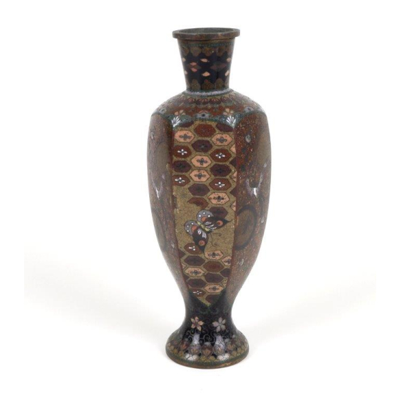 Belíssimo vaso de cloisonné (esmaltado com separações metálicas), de corpo globular sobre base anelada, bico fino curvado e alça arqueada, acompanhado de tampa original com botão em formato de botão floral. A peça é inteiramente decorada com ricas reservas ornamentais, destacando, de um lado, uma fênix (hou-ou) em voo com plumagem policromada em tons de verde, azul, amarelo e vermelho, e do outro, borboletas entre flores estilizadas sobre fundo acobreado. O pescoço da peça é decorado com padrões florais multicoloridos sobre fundo azul-escuro, emoldurado por frisos geométricos e motivos florais tradicionais. A técnica do cloisonné, com os fios de cobre formando as células preenchidas com esmaltes vítreos, demonstra o refinamento e a precisão da produção japonesa voltada ao mercado de exportação durante o Período Meiji - Japão - 20 cm alt.