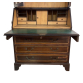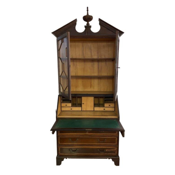 Tromeau em madeira, com cristaleira em vidro, parte inferior uma cômoda papeleira com porta basculante, com cinco gavetas, e puxadores em bronze. 235 x 96 X 46 cm.(No estado).