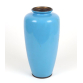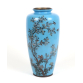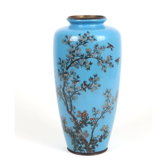 Belíssimo vaso japonês de cloisonné, de corpo alongado com base e boca circulares. O fundo em esmalte azul celeste translúcido serve de cenário para uma delicada composição de ramos de cerejeira em flor, com pequenas flores brancas e rosadas detalhadas com fios de cobre, além de pequenos pássaros em voo entre os galhos. A peça é finalizada com bordas metálicas escurecidas e fundo em bronze marcado. Selo da oficina Hayashi Kodenji , um dos mais renomados mestres do cloisonné de Nagoya, ativo no final do século XIX ao início do século XX. (período Meiji).vaso cloisonne azul celestial - 32 cm alt, 14 cm diâm. (Apresenta trinca no esmalte)