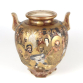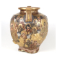 Imponente vaso japonês em porcelana do tipo Satsuma, de corpo globular com duas alças em voluta e boca aberta, ricamente decorado com a tradicional cena dos Rakan (Arhats ou Imortais do Budismo Zen). As figuras, dispostas em toda a superfície, são representadas com detalhamento individual em seus rostos, expressões e vestes, com auréolas douradas e fundos trabalhados em padrões de ondas e arabescos.O trabalho de douração (kinrande) é meticuloso, aplicado em relevo (moriage), contrastando com esmaltes em tons suaves e fundo marfim com craquelê fino. Os ombros do vaso apresentam friso decorativo em dourado, reforçando a estética luxuosa típica das peças de exportação do final do Período Meiji (c. 1880-1910).Na base, a cartela retangular apresenta a marca Dai Nippon Satsuma Hotoda-zō, identificando a produção como oriunda da prestigiada oficina Hotoda, acompanhada do brasão do Clã Shimazu.aso satsuma - 32 x 25 cm.