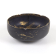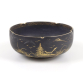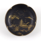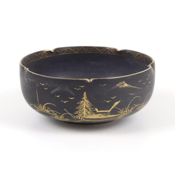 Rara tigela em porcelana japonesa do tipo Satsuma, moldada com borda ondulada e fundo abaulado, destacando- se pela decoração em esmalte negro (kuro-satsuma) e delicados desenhos aplicados em douração (kinrande). O interior e o exterior da peça são decorados com uma cena de paisagem tradicional, composta por montanhas, pinheiros, pagode, vegetação aquática e aves em voo, representadas em dourado sobre o fundo negro, criando um efeito de contraste marcante.O trabalho é minuciosamente detalhado, com friso geométrico ao longo da borda superior. A base apresenta o brasão do Clã Shimazu e uma cartela vertical com inscrição caligráfica (parcialmente apagada), típica das produções de Kyoto Satsuma voltadas para exportação, finais do Período Meiji (c. 1880-1910). 5 x 12,5 cm.