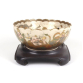 Magnífica tigela de porcelana Satsuma, de corpo globular com borda recortada em formato de pétalas, ricamente decorada com cenas representando os Shichifukujin, os Sete Deuses da Fortuna do panteão japonês, em poses festivas e rodeados por nuvens e arabescos dourados. A decoração é minuciosamente executada em esmaltes policromados com abundantes detalhes em ouro, sobre fundo marfim pontilhado com craquelê fino. A parte interna exibe os deuses em uma cena central detalhada, enquanto o exterior da tigela repete as figuras em reservas, integradas a motivos florais. A base é marcada com o brasão Shimazu e o selo dourado do ateliê Hododa, típico das produções de alta qualidade voltadas para exportação no período Meiji.O ateliê Hododa foi um importante exportador de peças de porcelana Satsuma, ativo no final do Período Meiji (1868-1912) e Taisho (1912-1926). 9 cm alt, 24 cm diâm.