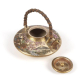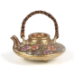 Delicada miniatura de bule de porcelana Satsuma, de formato achatado, com bico curvo e alça de arame trançado revestido em palha. Apresenta uma exuberante decoração em esmaltes policromados e abundante uso de dourado, representando ramos floridos de ameixeiras (ume) e pássaros em pleno voo, inseridos em uma paisagem montanhosa tradicional japonesa.O tampo, ricamente ornamentado com padrões geométricos dourados e arabescos, é removível e decorado com florais em ouro. A base do bule descansa sobre quatro pequenos pés, cuja parte inferior é decorada com flores douradas, assinada na base com cartela retangular preta contendo os caracteres dourados (Kizan), atestando sua origem na escola de Satsuma, no sul do Japão. Período: Final Meiji – início Taisho (circa 1900-1920) - Japão - 10 cm comp.