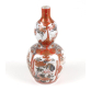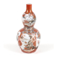 Magnífico vaso japonês de porcelana Kutani-yaki, moldado na forma de cabaça dupla (hyotan), símbolo de longevidade e prosperidade na cultura japonesa. A superfície é ricamente decorada no estilo Imari), com reservas de fundo branco esmaltado contendo cenas florais e aves (tsuru e pavões), intercaladas por áreas preenchidas com arabescos e motivos geométricos em vermelho-ferrugem, azul-cobalto e douração (kinrande). A técnica emprega esmaltação policromada vívida, com destaque para os detalhes minuciosos das flores de crisântemo, peônias e folhas, distribuídas em painéis de bordas em volutas. A base ostenta a inscrição Kutani Seirī Sei), identificando a origem e o atelier responsável, mantendo a tradição da escola Kutani do período Showa (provavelmente meados do século XX).vaso satsuma dupla bola quatro reservas passaros flores casario - Japão - 16,5 cm.