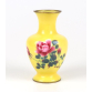 Elegante vaso de cloisonné japonês, de pequenas dimensões, com corpo bojudo e pescoço alongado. O fundo em esmalte amarelo vivo serve de contraste para a delicada decoração floral, com ramos de rosas em tons de rosa e folhas verdes em esmalte pintado à mão. Borda e base com filetes metálicos, acabamento interno em esmalte amarelo. Peça de trabalho fino, datavél da primeira metade do século XX, produção para exportação- Japão - 16 cm.