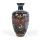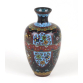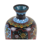 Gracioso vaso japonês de cloisonné, de pequenas dimensões, com corpo bojudo e pescoço curto, levemente afunilado. A peça apresenta fundo em esmalte preto com decoração em painéis geométricos, preenchidos com flores estilizadas em esmaltes coloridos, nos tons de azul, amarelo, verde e branco, entrelaçados com arabescos dourados. Um friso horizontal em esmalte vermelho escuro, decorado com pequenos círculos e folhas, atravessa o corpo do vaso, criando uma divisão harmoniosa no desenho. Pescoço e base com detalhes em azul celeste. Produção japonesa do início do século XX (c. 1920-1930), representando o estilo mais popular de cloisonné “export ware”. 15,5 cm.