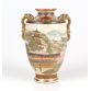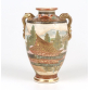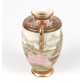 Elegante vaso de porcelana Satsuma com formato baluster e duas alças laterais em forma de dragões estilizados dourados. A peça é ricamente decorada com cenas de paisagem, retratando pagodes e templos tradicionais em meio a montanhas e pinheiros, utilizando a tradicional paleta de cores em tons de marrom, verde, preto e dourado sobre fundo marfim com craquelê fino. O bordo superior apresenta friso geométrico com detalhes em dourado, realçando o trabalho minucioso da pintura esmaltada. O fundo do vaso exibe a marca com caracteres japoneses Inoue, nome do ateliê/artista responsável pela peça, tradicional da escola Satsuma.Trabalho refinado da segunda metade do período Meiji, produzido para exportação ao mercado ocidental - 17 cm alt, 9 cm diâm.