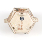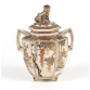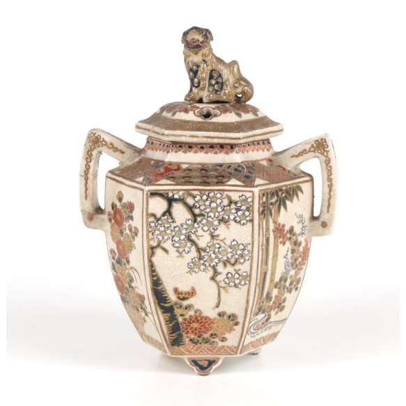 Elegante incensário hexagonal de porcelana Satsuma, com tampa perfurada e botão em forma de shishi (cachorro-leão guardião), finamente modelado e esmaltado. O corpo apresenta delicadas reservas emolduradas, decoradas com cenas de paisagens florais, incluindo ramos de cerejeiras em flor, bambus e crisântemos, minuciosamente delineados em esmaltes policromados e ricos detalhes em ouro. As duas alças laterais de formato angular harmonizam com a forma facetada do corpo, repousando sobre três pequenos pés. A tampa, emoldurada por frisos geométricos e florais, possui perfurações para liberação da fumaça do incenso. A base exibe a típica marca vermelha com o brasão Shimazu e a inscrição "Touya Hitsuyaki - Tomonobu", indicando produção artesanal da escola Satsuma no período Meiji (1868-1912). 23.5 cm incluindo a tampa com shishi - 14 cm alt, (Necessita restauro na tampa)