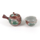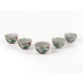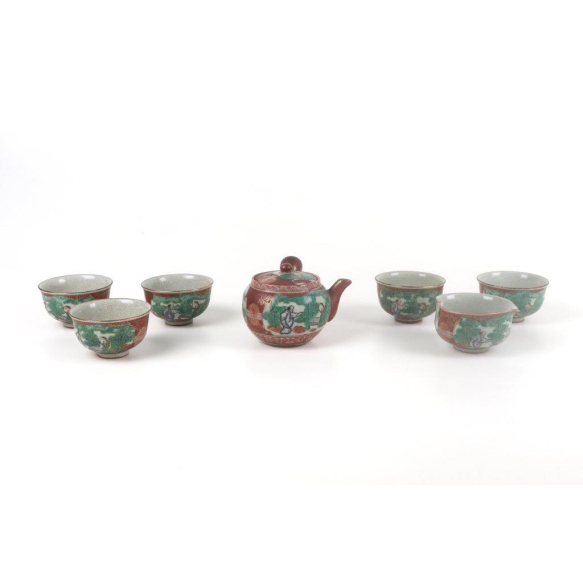 Conjunto de chá japonês composto por bule Kyusu com tampa e cinco tigelas (yunomi), de porcelana fina em estilo Kutani, com decoração minuciosa em esmaltes policromados sobre fundo craquelado marfim. O bule apresenta corpo globular com bico lateral, decorado com reservas cartuchadas representando cenas de sábios em meio a pinheiros e montanhas, alternadas com áreas de esmalte vermelho ferrugem (akae) com detalhes geométricos em dourado (kinrande).As tigelas acompanham o mesmo padrão decorativo, com delicados ramos florais e reservas paisagísticas, e apresentam esmaltação interna em celadon. O conjunto é um exemplo típico da produção para exportação no final do Período Meiji, quando a escola Kutani desenvolveu peças ricamente decoradas para o mercado ocidental.O selo sob as bases é um monograma estilizado do estúdio ou artista - Período: Meiji/Taisho (c. 1900-1920) - Japão, Kutani Medidas do Bule (Kyusu): 8 x 12 x 12 cm cm Diâm. das Tigelas (Yunomi): 4,5 x 7,5 cm