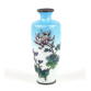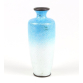 Delicado vaso japonês de cloisonné, de pequenas dimensões, com forma cilíndrica suavemente afunilada e pescoço estreito. O fundo apresenta um gradiente em esmalte translúcido, partindo do branco na base até o azul celeste no topo, sobre um padrão escamado (ginbari) em prata. A decoração floral exibe crisântemos em tons de lilás, azul e verde, minuciosamente contornados por fios de cobre, destacando-se com refinamento sobre o fundo esmaltado. A base metálica possui marca gravada, indicando provável produção da escola de cloisonné de Owari (Nagoya), datável do início do século XX (c. 1920-1930). 15 cm.