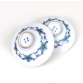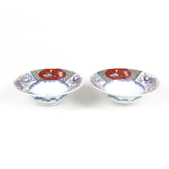 Par de tigelas japonesas em porcelana esmaltada, decoradas em policromia com destaque para tons vermelhos, verdes e azul cobalto, estilo tradicional Imari (Arita).O centro das peças exibe o ideograma Kotobuki, símbolo de longevidade e felicidade, frequentemente utilizado em peças comemorativas. As paredes internas são segmentadas em painéis decorativos, alternando imagens de dragões e fênix (Hô-ô), símbolos de poder e prosperidade, com arabescos florais em fundo verde, em composição simétrica.A base de cada peça apresenta uma marca manuscrita de quatro caracteres, possivelmente referência poética ou assinatura de ateliê. Século XX (provavelmente entre Era Taisho e Showa).duas tijelas imari - 4 cm alt. 13 cm diâ.