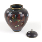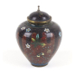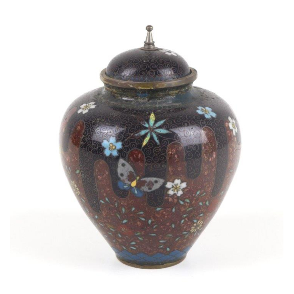 Pequeno pote japonês de cloisonné, de corpo globular e tampa cônica com pináculo, apresentando um fundo em esmalte preto decorado com intricados arabescos em fios dourados (kinmon). A decoração é composta por faixas verticais em esmalte vermelho ferrugem, alternadas com flores de diversas espécies e borboletas, esmaltadas em tons de azul, verde, amarelo e branco. A tampa segue o mesmo padrão decorativo com detalhe metálico na borda e pináculo superior. Produção japonesa do final do período Meiji (c. 1900-1910), esta peça foi originalmente concebida como kogo (caixa de incenso) ou pequeno potiche ornamental - 12 cm.