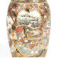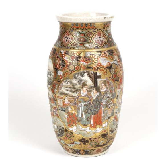 Elegante vaso de porcelana japonesa Satsuma, de forma cilíndrica com boca ligeiramente alargada e borda sem esmalte, decorado com cenas minuciosas representando guerreiros samurais em trajes de batalha e nobres em um ambiente de corte feudal. A decoração é disposta em reservas com contornos dourados que se destacam sobre um fundo de padrões geométricos hexagonais (kikko) e florais, todos ricamente ornamentados com douração intensa e policromia vibrante. O cenário detalha armaduras, espadas e estandartes de guerra, entremeados por paisagens com montanhas e arquitetura tradicional japonesa. A parte superior do vaso é adornada com faixas de motivos florais estilizados em relevo, que enfatizam o refinamento artístico da peça. Esta peça é um exemplo clássico da produção Satsuma Meiji - Taisho, com ênfase na ornamentação luxuosa e narrativa histórica, características das peças produzidas para exportação no final do século XIX e início do século XX.vaso satsuma sem marcas guerreiro 31 cm. 16 cm diâm.