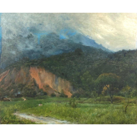 Luís Graner(1863 - 1929) - paisagem - OST - CIE - 60 X 74 cm. Etiqueta " Roberto Magalhães Gouvêa ". Lluís Graner i Arrufí (Barcelona, 1863 – 1929) foi um pintor catalão realista e empreendedor cultural, conhecido por seu domínio da luz e por explorar cenas do cotidiano com forte carga emocional e dramática. Formado na Escola de la Llotja em Barcelona, teve como mestres Antoni Caba e Benet Mercadé, e completou sua formação em Madrid e Paris, onde absorveu influências acadêmicas e impressionistas. Sua pintura é marcada pelo uso expressivo do claroscuro, criando atmosferas íntimas e carregadas de emoção. Graner representava temas sociais - como músicos populares, velhos, bebedores e camponeses - com uma abordagem quase teatral. Também pintou paisagens e retratos com grande sensibilidade para a luz e a composição. Além da pintura, teve papel inovador na cultura catalã ao fundar a Sala Mercè em Barcelona (1904), um espaço artístico multifuncional projetado por Antoni Gaudí, que combinava cinema, música, poesia e luzes cenográficas - uma proposta de arte total (inspirada no conceito de Gesamtkunstwerk de Wagner). No entanto, o projeto fracassou financeiramente, levando-o à ruína em poucos anos. Após esse período, Graner passou a viver na América, com passagens por Havana, Nova York, Nova Orleans e Rio de Janeiro. Lá, continuou a pintar, especialmente retratos e paisagens urbanas e rurais, agora com pinceladas mais soltas e cores mais vibrantes. Voltou a Barcelona em 1928 e faleceu no ano seguinte.