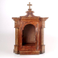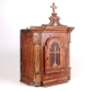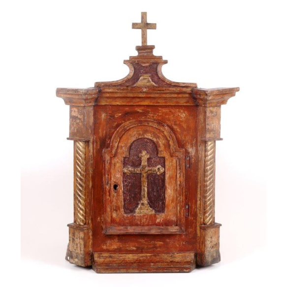 Antigo oratório em madeira madeira patinada e policromado, com porta frontal em arco com cruz em relevo e colunas laterias torneadas. 68 cm alt, 49 x 33 cm. Sec XVIIIXIX