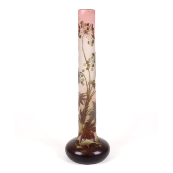 ÉMILE GALLÉ (1846–1904) – Grande vaso em vidro artístico acidado com motivos vegetais, produção Art Nouveau francesa, França, séc. XIX/XX; Gallé foi mestre vidraceiro francês e principal expoente da Art Nouveau, fundador da Escola de Nancy. Dimensões: alt. 75 cm, diâm. 23 cm.