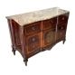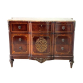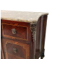 Comôda papeleira em madeira marchetada e aplicações em bronze com três gavetas e tampo de mármore - 87 cm alt, 131 x 52 cm. (Com leve perda de matéria).
