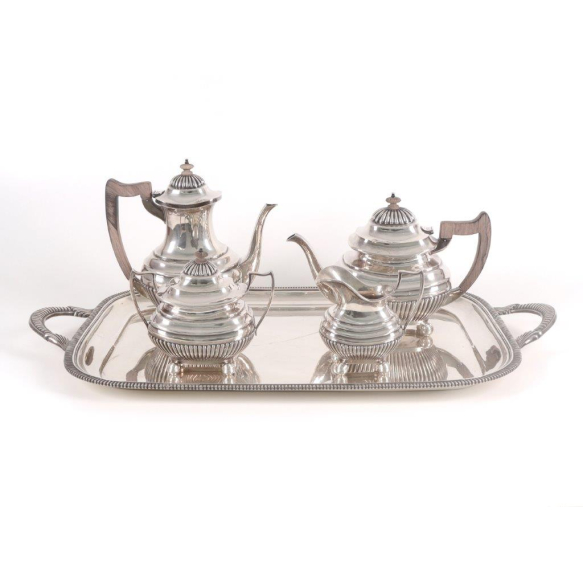Imponente jogo de chá em prata de lei Composto por 4 peças mais a bandeja marca do 1º título, prateiro Ferreira Marquez - contraste Águia. Portugal Sec XX