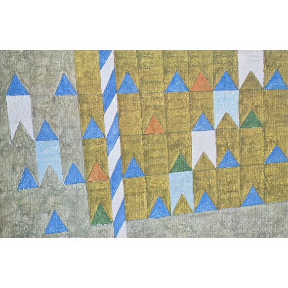 Alfredo Volpi - Mastro e bandeirinhas - 64-132. Offset sobre tela, 32x49 cm, 1985, sem assinatura. Reprodução autorizada feita pela Litografia Mattavelli. Com moldura