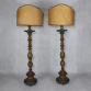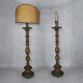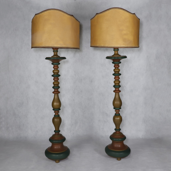 Par de tocheiros de madeira - Brasil, século XX. Par de tocheiros de madeira nobre policromada de verde e marrom. Haste com decoração de elementos piriformes e em bolachas, intercalados e sobrepostos, encimando base bojuda; 210 cm de altura total e 162 cm de altura, sem a parte cilíndrica de madeira adaptada, como se vela fosse, para sustentação de cúpula bege e elementos da eletrificação. Origem: espólio de Cárbia Sabatel Bourroul e José Celestino Monteiro de Barros Bourroul.