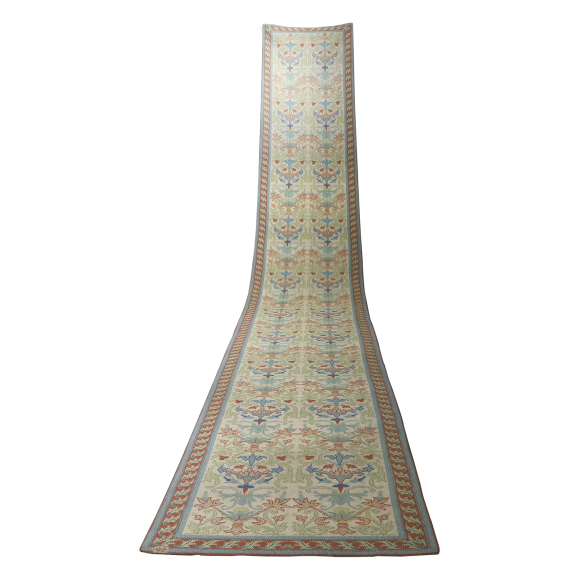 Passadeira Casa Caiada – Pernambuco, Brasil, século XX. Passadeira de lã, de fabricação da Casa Caiada, bordada com decoração floral sobre tela; 9,04 m x 1,21 m ou 10,93 m². Origem: espólio de Cárbia Sabatel Bourroul e José Celestino Monteiro de Barros Bourroul.
