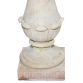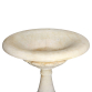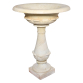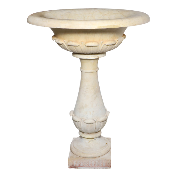 Pia Bastimal. Mármore - Brasil, século XIX. Pia bastimal de mármore. Cuba circular, com aba revirada, sobre coluna em balaustre com decoração de folhas estilizadas em relevos e base almofadada. O todo sober base quadrada de 28,5 cm de lados x 5 cm de altura e inscrição Pirassununga. Na base da coluna inscrição: Feliciano Luiz de Oliveira Cesar / 1897; 73,5 cm de diâmetro e 102 cm de altura total Apresenta restauro profissional na aba da cuba e algumas poucas marcas do tempo.