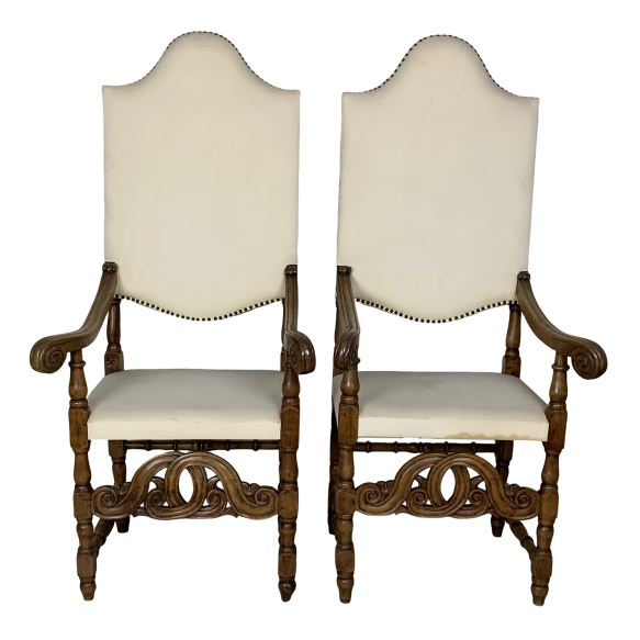 Par de poltronas de madeira nobre estilo Louis XIV. Brasil, século XIX/XX. Par de poltronas de madeira de nobre estilo Louis XIV. Assento e encosto estofados e revestidos de tecido bege. Braços ligeiramente abertos, terminados em espiralado e quatro pernas torneadas e em seções terminadas em ponteiras, unidas na parte anterior por trave com curvas, recurvas e vazados e nos demais lados por traves roliças, também lavradas em seções; 68 cm de comprimento, 61 cm de largura e 153 cm de altura total. Pequena mancha em uma delas, na parte frontal e em um dos lados. Apresentam marcas do tempo e uso. Origem: espólio de Cárbia Sabatel Bourroul e José Celestino Monteiro de Barros Bourroul.