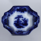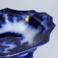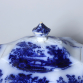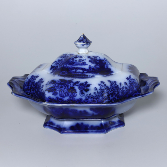 Guiseira de Faiança. Inglaterra, século XIX. Guiseira de faiança policromada, azul e branco, dita "azul borrão", com profusa e tradicional decoração orientalista. Caldeira com borda e base elevadas, ambas movimentadas. Tampa com mesmo movimento e puxador no formato de botão; 31,7 cm de compimento, 25,7 cm de largura e 19 cm de altura total. A caldeira apresenta quebrado na borda, colado à maneira amadora, deixando pequena perda de matéria, um pequeno vazado.